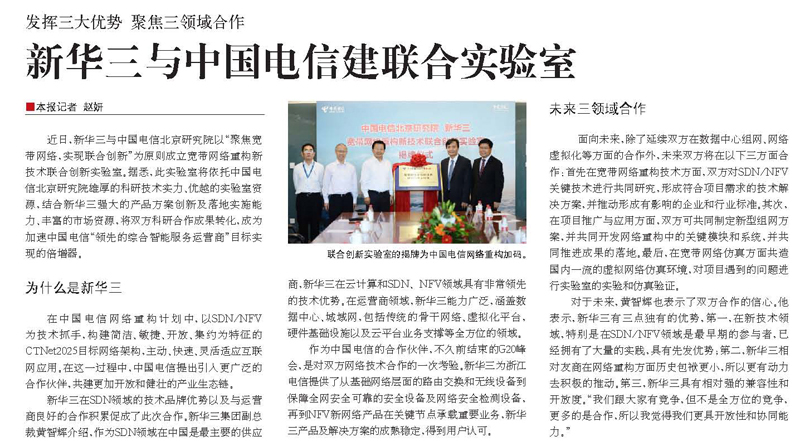發揮三大優勢 聚焦三領域合作 新華三與中國電信建聯合實驗室(《通信產業報》)